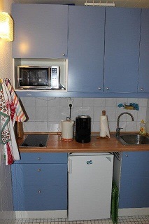 Die Küchenzeile befindet sich im Flur der Wohnung. Hier stehen zwei Herdplatten, eine Mikrowellen-Backofen-Kombination, eine Kaffeepadmaschine und ein Wasserkocher zur Verfügung. Auch ein Handmixer, ein Mixstab und ein Waffeleisen sind vorhanden. Hier findet man auch Töpfe, Schüsseln und Geschirr. Mehr Geschirr und Gläser sind in den Schränken im Wohnzimmer.