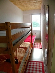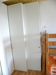 Im Schlafzimmer stehen ein Etagenbett und ein Schlafsofa, das zum Doppelbett mit 1,5m Breite ausgeklappt werden kann. Der Kleiderschrank bietet viel Platz. Der Leuchtturm kann als Nachtlicht dienen.