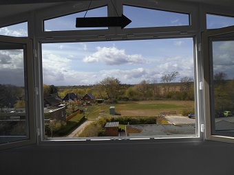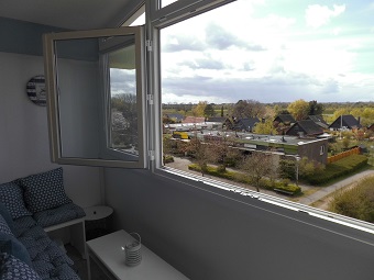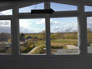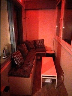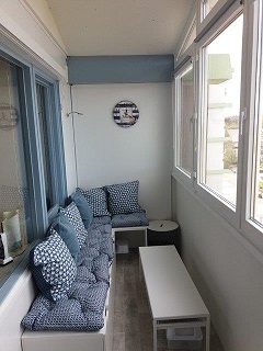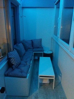 Den Balkon haben wir verglasen lassen. So ist ein kleiner Wintergarten entstanden. Man kann aber die Fenster auch groß aufmachen. Abends lässt sich der Raum indirekt farbig beleuchten. Der Balkon hat Süd-West-Lage. So lassen sich von hier aus auch fantastische Sonnenuntergänge genießen. Mit etwas gutem Willen hat man auch seitlichen Meerblick.