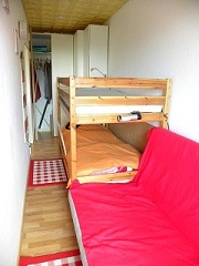 Im Schlafzimmer stehen ein Etagenbett und ein Schlafsofa, das zum Doppelbett mit 1,5m Breite ausgeklappt werden kann. Der Kleiderschrank bietet viel Platz. Der Leuchtturm kann als Nachtlicht dienen.