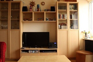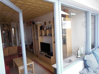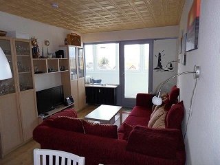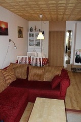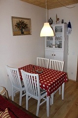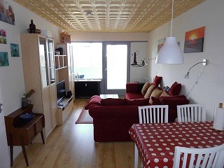 Das Wohnzimmer besteht aus dem Wohn- und dem Essbereich. Das Sofa lässt sich in ein Doppelbett verwandeln.
